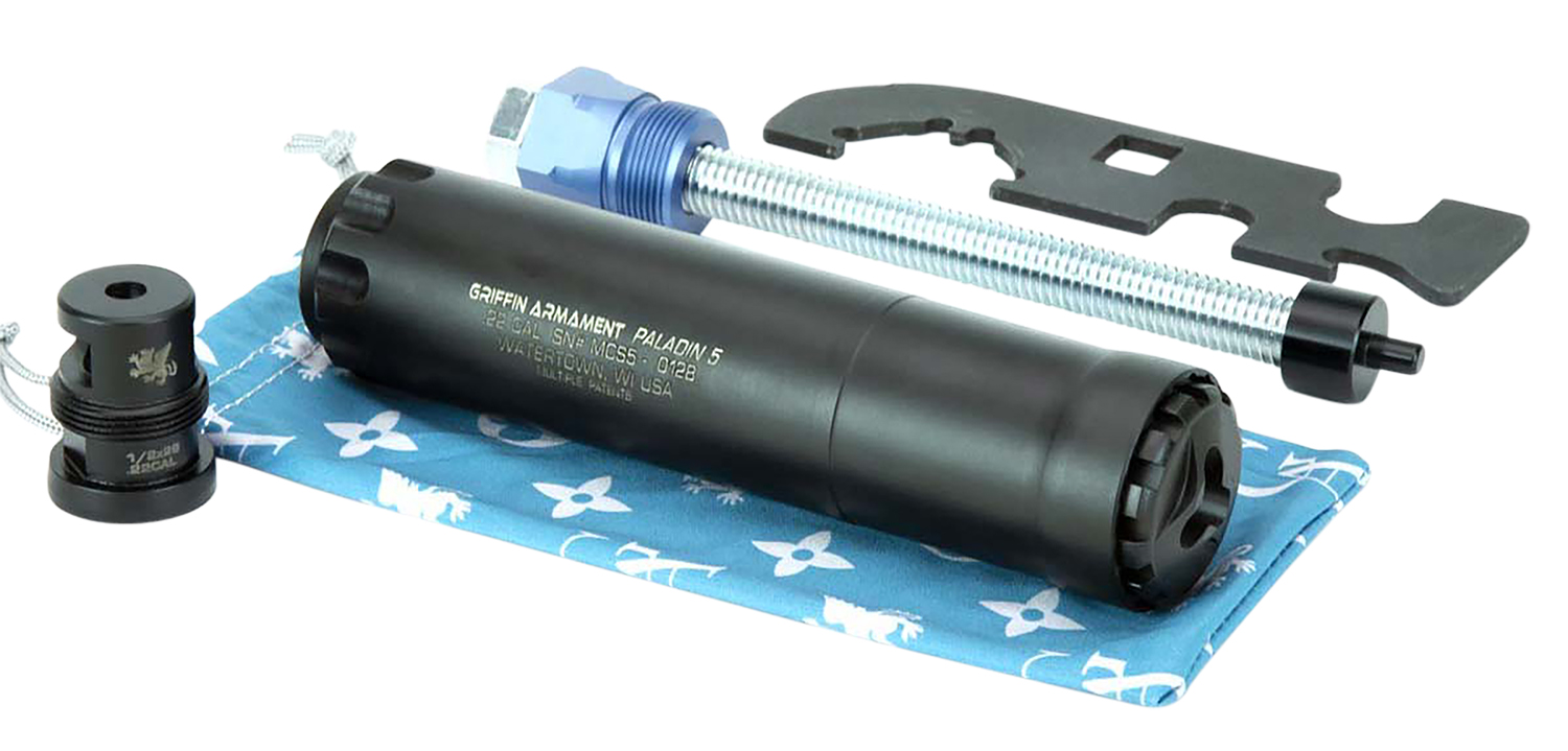 Griffin Armament GAPD5HDW Paladin 5 22 Cal (5.56mm) Rated Up To 22-250 Rem, 5″ L, Black Stainless Steel with User Serviceable Design, 1/2″-28 tpi Taper Mount EZ Brake