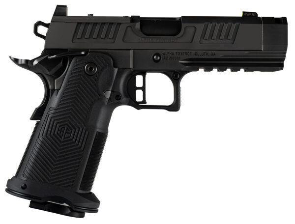 The AF1911 Romulus is hammer fired featuring a SUS416 black polished DLC finish on the frame and slide; Bull ramped, pressed compensated barrel; injected polymer grip module; extended beavertail, Double Stack magazine; glowing night sights; extended slide release: flared magwell; Picatinny rail; RMSC optics cut; ambi thumb safety. Includes MOS adapter plate, RMSC and RMR plate, two 10rd magazines.
