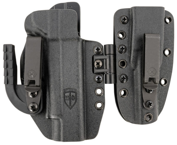 The Covert MOD1 IWB holster is designed for any red dot on the market and has an open bottom that will fit your threaded barrels and compensators. Features a solid locking retention (audible and tactile “click” when securely holstered), extra tall sight channels to allow for tall suppressor sights and patent-pending hinge system conforms with the body during movements.