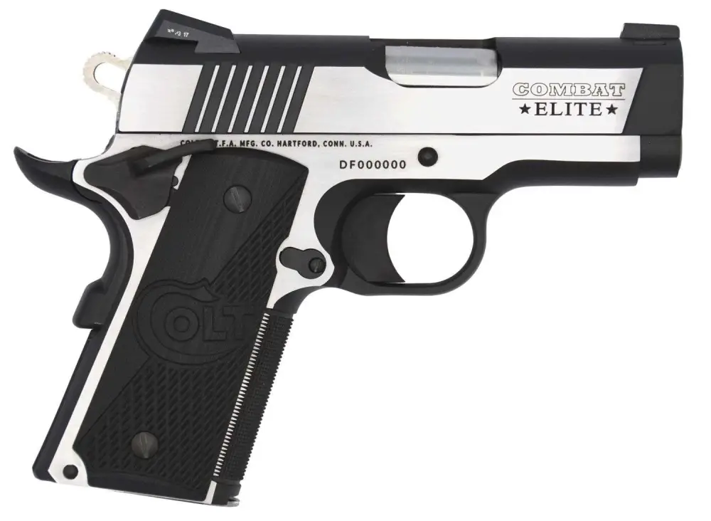 The Colt Combat Elite Defender allows for maximum concealment with the compact 3″ barrel and carry Bevel slide. The Defender has full stainless steel construction with a unique two tone PVD finish which makes for a striking corrosion package. The Dual Spring Recoil System reduces felt recoil while extending the recoil spring life. Features a genuine Novak night front sight and Novak Low Mount Carry night sight. Safeties are Ambi-Extended Thumb Safety, Upswept Beavertail Grip Safety and Series 80 Firing Pin Safety. Solid Aluminum trigger with a trigger weight of 4.5-6 lbs. Specs- OAL 6.75″, OAH 5.125″ and OAW 1.25″; barrel technical specs- 1:16 LH, 6 Groove N.M. and locked breech operating system. Accessories include- magazine, cable lock and instruction manual.