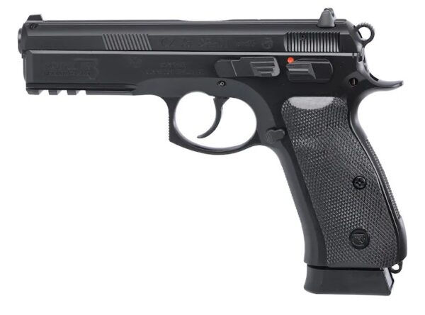 The CZ 75 SP-01 is a full-size SA/DA pistol that blends classic CZ 75 reliability with upgraded ergonomics and manufacturing from the NATO-approved P-01. It features an integrated 1913 rail, rubber grips, and a corrosion-resistant black polycoat finish.