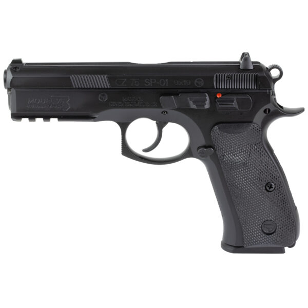 The CZ 75 SP-01 is a full-size SA/DA pistol that blends classic CZ 75 reliability with upgraded ergonomics and manufacturing from the NATO-approved P-01. It features an integrated 1913 rail, rubber grips, and a corrosion-resistant black polycoat finish.