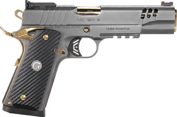 Brand: European American Armory Talo Model Specific: Girsan MC1911 Match Negotiator Type: Pistol: Semi-Automatic Caliber/Gauge: 10 MM Capacity: 9+1 Barrel Length: 5″ Sights: Rear Adjustable, Front Fiber Finish: Titanium Nitrate Slide: Lighting Cuts Minimum/Overall Length: 8.75 Grips: G10 10 laminated and checkered for superior grip performance Features: Titanium Nitrate Gold Accents Hand-tuned Action Extended Beavertail Enlarged grip safety Ambidextrous Safeties Checkered Front Strap Long hole hammer Operating System: Recoil Operated Firing System: External Hammer Frame Material: Forged Carbon Steel Slide: Carbon Steel Trigger: Skeletonized Magazine Type: Detachable Box Magazine Trigger Pull Average: 4/5 Trigger Guard: Steel Barrel: Custom Carbon Steel Barrel: Conventional 1911 Lock Up Action: Hand Tuned Cable Trigger Lock: Yes Talo Exclusive