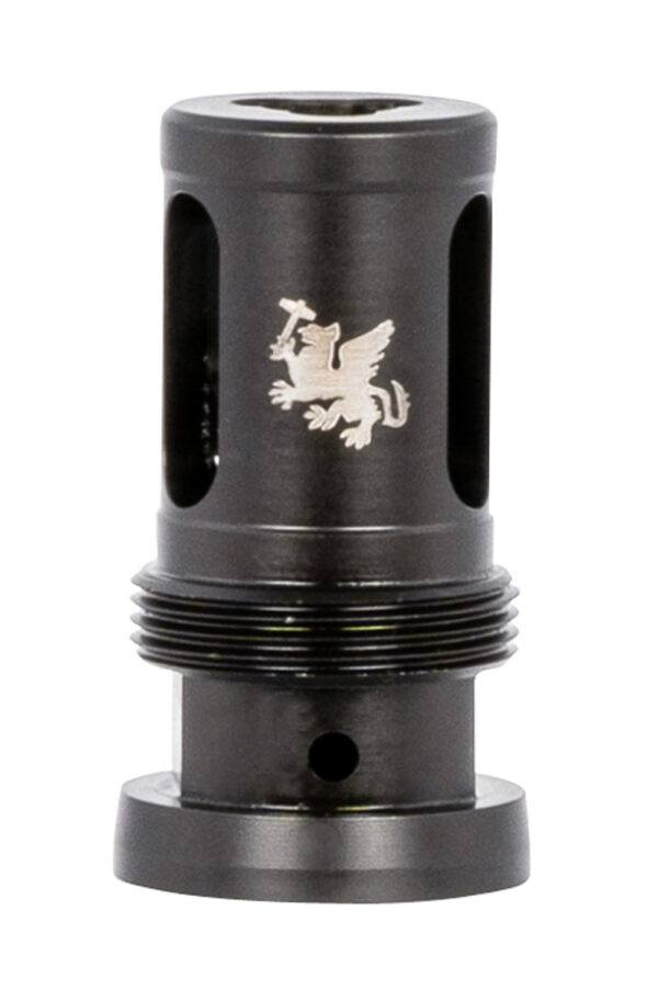 The Taper Mount Hammer Comp provides 2 sacrificial baffles that reduce recoil and ensure maximum service life of your suppressor. Slotted compensating features provide tuned muzzle stability. CNC machined from a solid bar of heat treated 17-4ph stainless steel, the Taper Mount Hammer Comp is built to last. This muzzle device is 1.89″ length from the countersunk thread shoulder to the front face, and is equal length to an A2 flash suppressor with .14″ thick crush washer, so it can be used in conjunction with so called “14.7” barrels which are marketed as able to be permed to 16.1″ non NFA length using an A2 and crush washer.