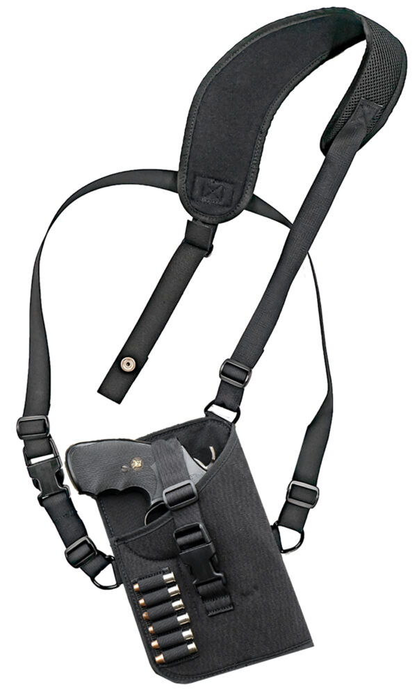 The GrovTec Ergonomic Trail Pack holster features an offset carry position for smooth and efficient draw of the handgun. It also uses a three point shoulder sling. No matter how rigorous the activity, your handgun is securely held and out of the way, yet remains immediately accessible. Adjusts to fit either beneath or on the outside of jackets. Includes belt loops and ammo pouch. Right Handed only. Fits 3-4″ barrel med/lg DA revolvers.