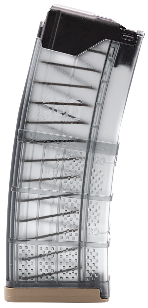 The L5AWM 300BLK has been specifically engineered for use with subsonic 300 Blackout ammunition, particularly 200+ grain cartridges. The updated internal geometry allows these longer heavier bullets to stack properly, which increases reliability when compared to a traditional .223/5.56 magazine. The outside of the magazine body is molded with 300 Blackout markings and the magazine ships with a contrasting flat dark earth base plate for easy visual identification.