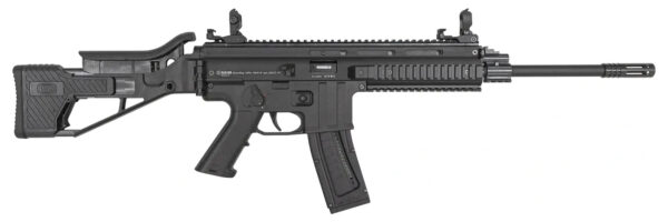 Caliber: .22 LR – Magazine Capacity: 10 rounds – Barrel Length: 414 mm / 16.3 in – Weight: 6.71 lb – Color: Black – Adjustable Flip-Up Sight – Ambidextrous Manual Safety – Ambidextrous Magazine Release – Adjustable Cheek Rest – Folding Stock – Ambidextrous Charging Handle