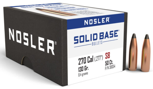 Nosler’s Solid Base® bullets are back a trusted design reintroduced for today’s hunters and handloaders. Built on decades of field-proven performance the Solid Base® line delivers the accuracy deep penetration and reliable expansion that hunters demand all at a price that keeps premium performance within reach. – Featuring Nosler’s heavy boat tail base Gen 5 tapered jacket and dependable soft point design Solid Base® bullets provide the confidence for clean ethical kills season after season. – Product Name 270 Caliber 130gr Solid Base® SP (50ct) – Box Qty 50 – BC G1 0.424 – Overall Length (OAL) (in.) 1.122 – Sectional Density (SD.) 0.242 – Diameter .277 – Bullet Base Boat Tail – Bullet Profile Spitzer – Bullet Type Solid Base – Bullet Weight 130gr – Caliber 270 – Lead Free No