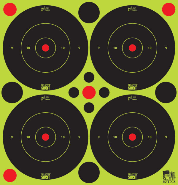 Pro-Shot’s SplatterShot Peel and Stick targets are excellent for low-light conditions for indoor/outdoor use. 3″ bullseyes. Bullet holes are revealed with bright green rings. Includes pasters for extended target use.