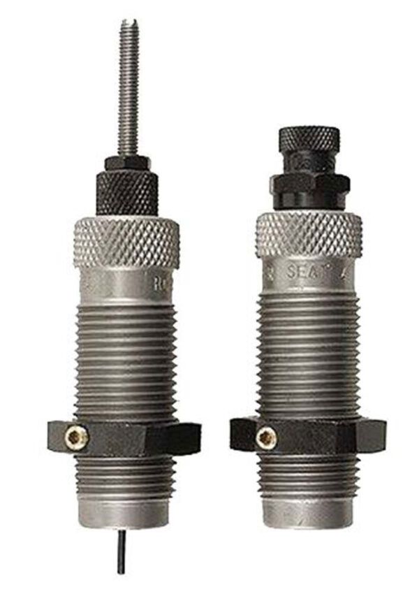 This two-die set is intended for reloading bottleneck cases, and consists of a Full-Length Sizer Die with an Expander-Decapping Unit, and a Seater Die with Bullet Seater Plug. The Full-Length Sizer Die brings the case to SAAMI minimum cartridge dimensions. It sizes the outside of the case, de-primes and expands the neck to accept the bullet. The die has vents to prevent case damage caused by trapped air and for excessive lubricant. Headspace is held to minimum tolerances to avoid changing the case body length during full length sizing. The included Seater Die has a built-in roll crimper to secure the bullet at the same time as it’s seated.