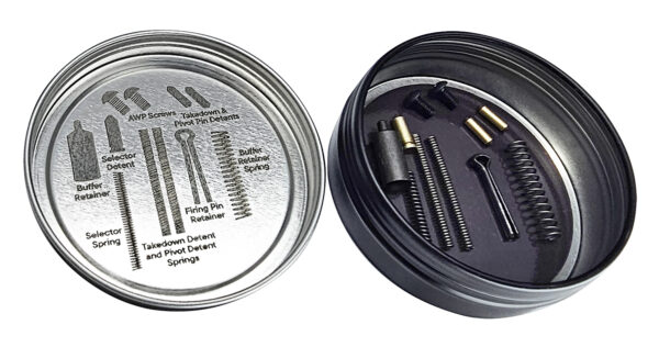 The parts of the Oh S#IT Kit are housed in a tin with a magnetic base that keeps all the parts sorted. On the inside of the lid is a to-scale image of all the included parts so you can easily identify each spare part. From screws to pins to detents, the RISE Oh S#IT Kit contains spare parts that can be impossible to find if dropped. This parts kit includes: Buffer Retainer (x1), Buffer Retainer Spring (x1), Anti-Walk Pin Screws (x2), Takedown & Pivot Pins Detents (x2), Takedown & Pivot Pins Springs (x2), Safety Selector Detent (x1), Safety Selector Spring (x1), Firing Pin Retainer (x1)