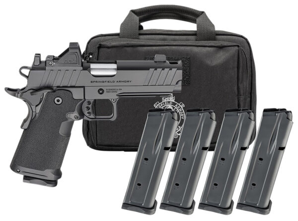 The Prodigy Comp 4.25″ takes the proven 1911 platform and enhances it with double-stack capacity and a performance-driven feature set. Reconfigured around a double-stack magazine, the polymer grip module mounts to a forged steel frame. The 4.25″ AOS-compatible slide and barrel assembly is integrally compensated to reduce muzzle rise, while a Picatinny rail is ready to accept today’s most popular accessories. The Prodigy Comp 4.25 combines the most beloved characteristics of the 1911 with modern capacity for unrivaled performance. The Gear Pac includes a Viridian RFX11 green dot optic, four magazines and a pistol bag.