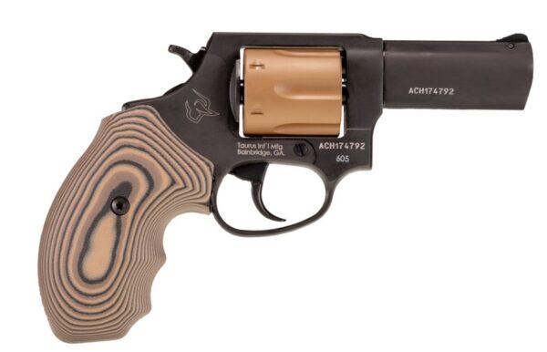 Brand: Taurus Talo Model: 605 – with optic mount for micro red dots (T.O.R.O – Taurus Optic Ready Option ) Type: Revolver: Double Action Caliber: 357 MAG Action: Double Action Barrel: 3″ Finish: Matte Black/ Troy Coyote Capacity: 6 Stock: Hyena Brown G10 VZ Grips Sight: FT: Serrated Ramp RR: Fixed